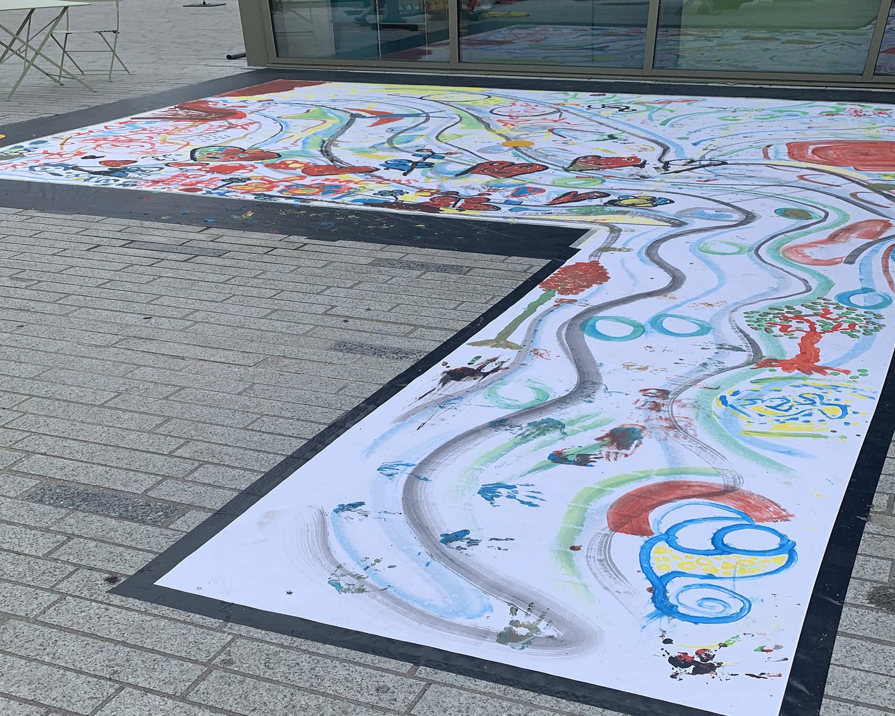Série de cinq photos d'un atelier participatif où enfants et adultes créent une fresque collective sur de longues bandes de papier blanc. La création colorée comporte des lignes sinueuses, cercles multicolores, arbres et empreintes de mains. L'atelier se déroule en extérieur sur une place publique et en intérieur dans différents espaces, accompagné par un musicien au saxophone.