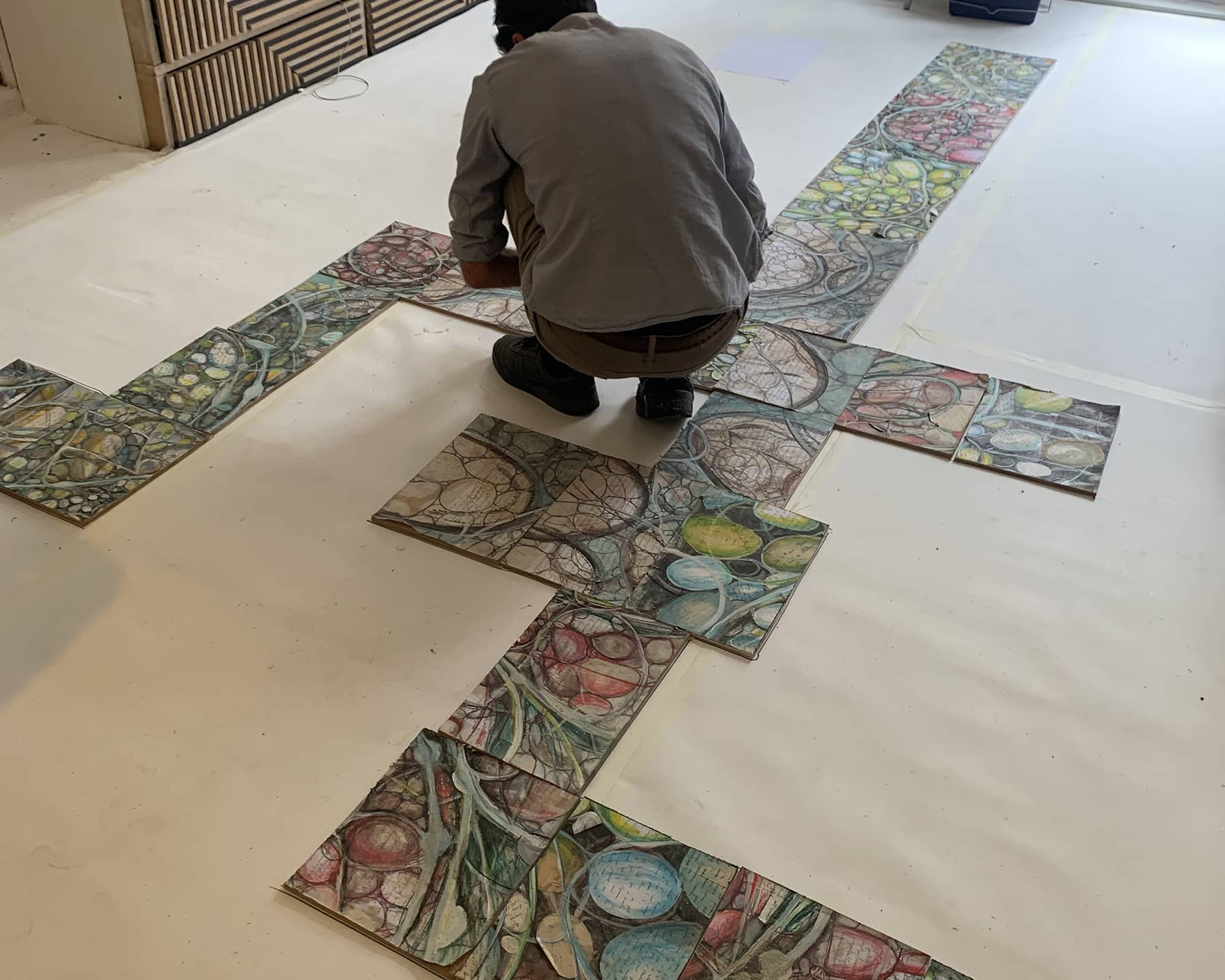 Série de cinq photos documentant différentes étapes de création artistique. On y voit des œuvres au sol avec des motifs organiques colorés et des lignes géométriques vertes, une participante écrivant un texte en rouge sur papier, une tache de peinture bleue liquide sur fond orange, et un artiste travaillant accroupi sur une installation en forme de croix composée de panneaux peints disposés dans un atelier.