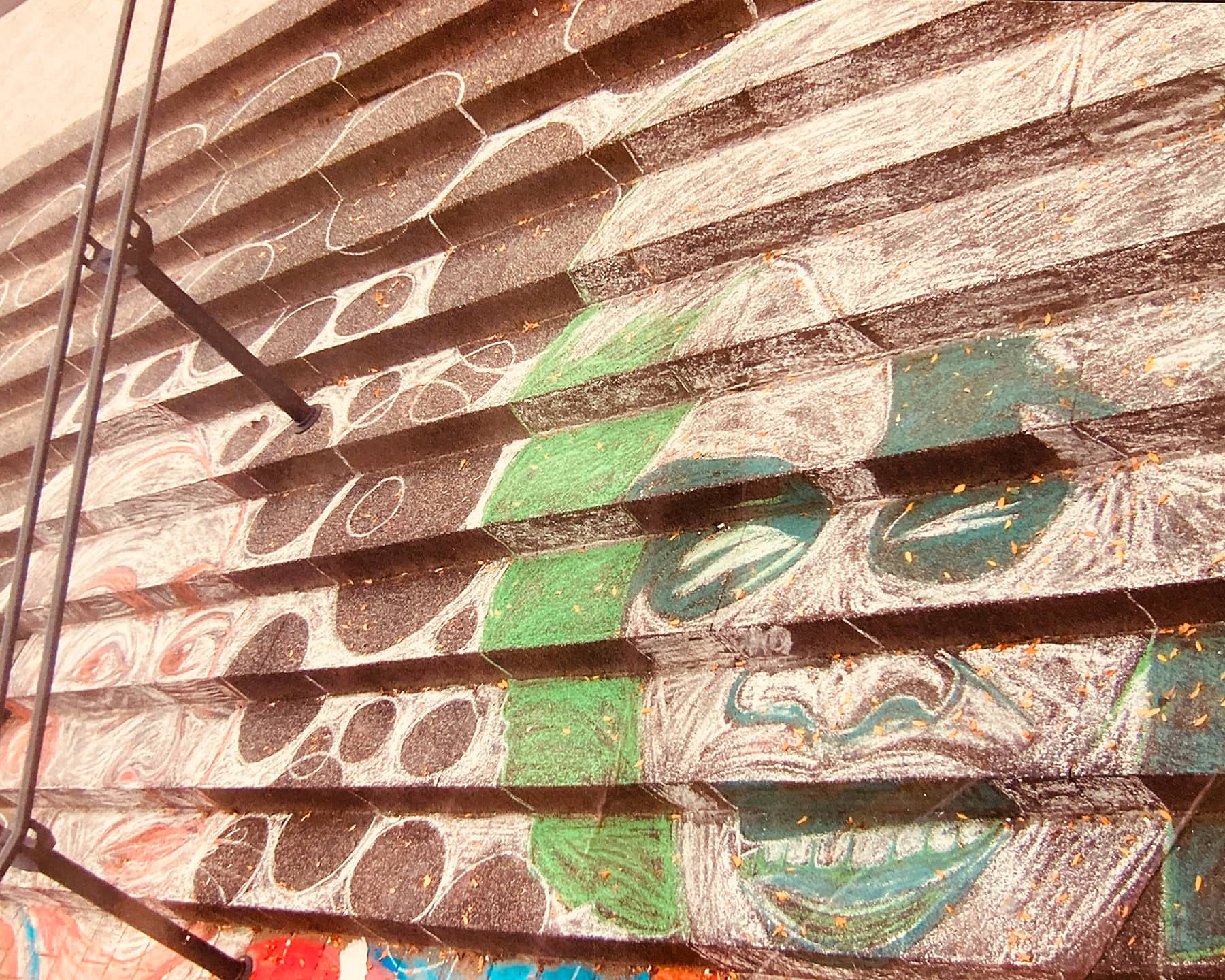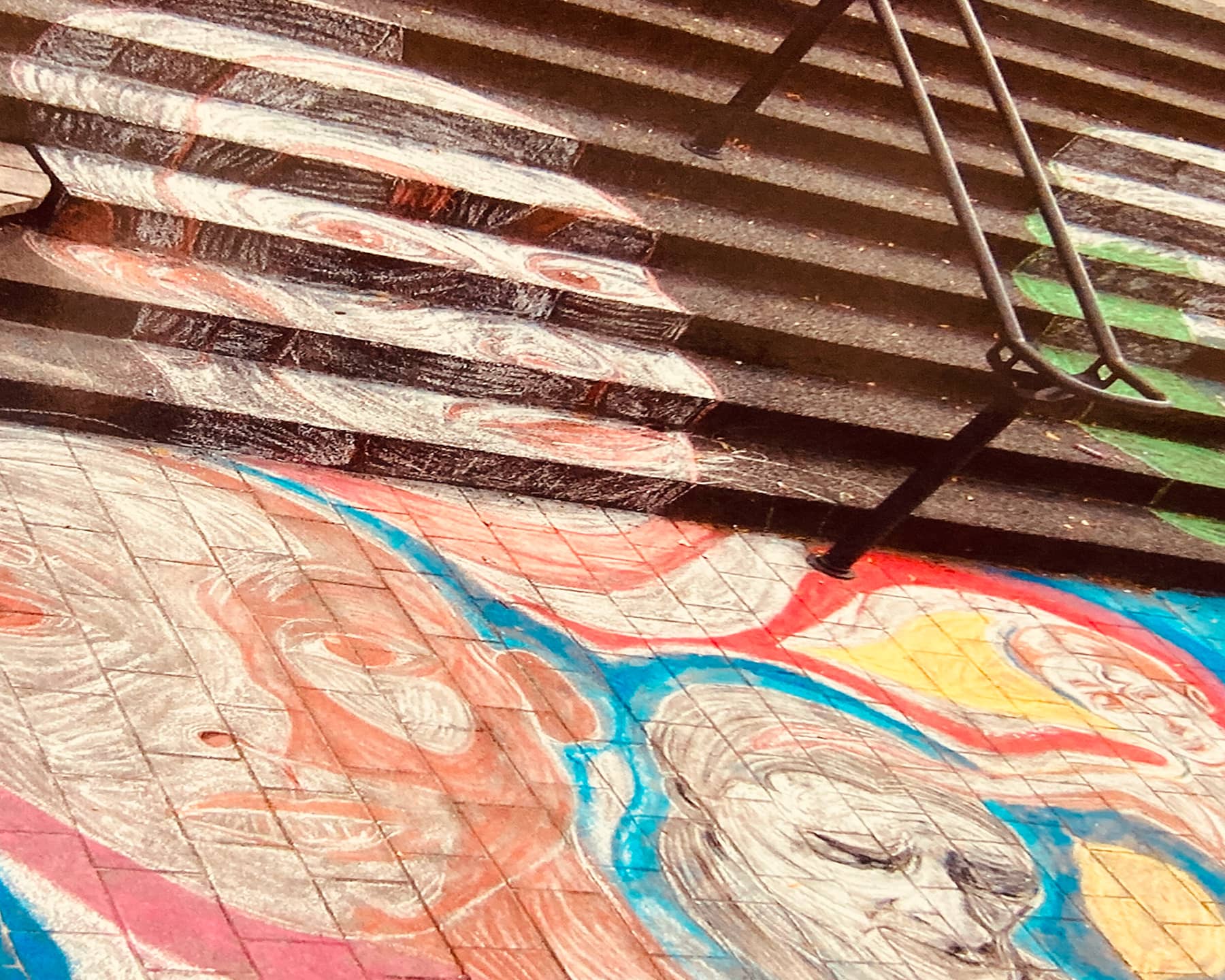 Série de cinq photos présentant des gros plans d'une fresque murale peinte sur un escalier extérieur. Les marches sont ornées de portraits expressifs aux traits dessinés à la craie ou au fusain, encadrés de bandes colorées rouge, rose, bleu et jaune. Certaines marches comportent des motifs de cercles concentriques orangés et roses. La composition joue avec l'architecture de l'escalier, transformant chaque marche en fragment d'une œuvre collective qui se déploie verticalement le long de la rampe métallique.