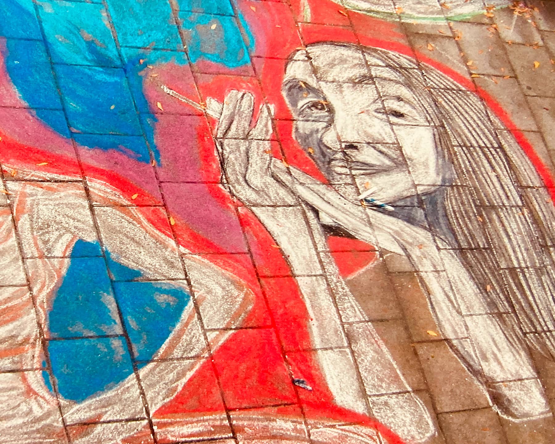 Pendant une semaine, j'ai travaillé sur place, en utilisant d'anciennes images issues des archives et de la craie, une matière fragile qui s'efface avec la pluie. Ce choix symbolisait la fugacité de l'hommage et la poésie éphémère de son œuvre.