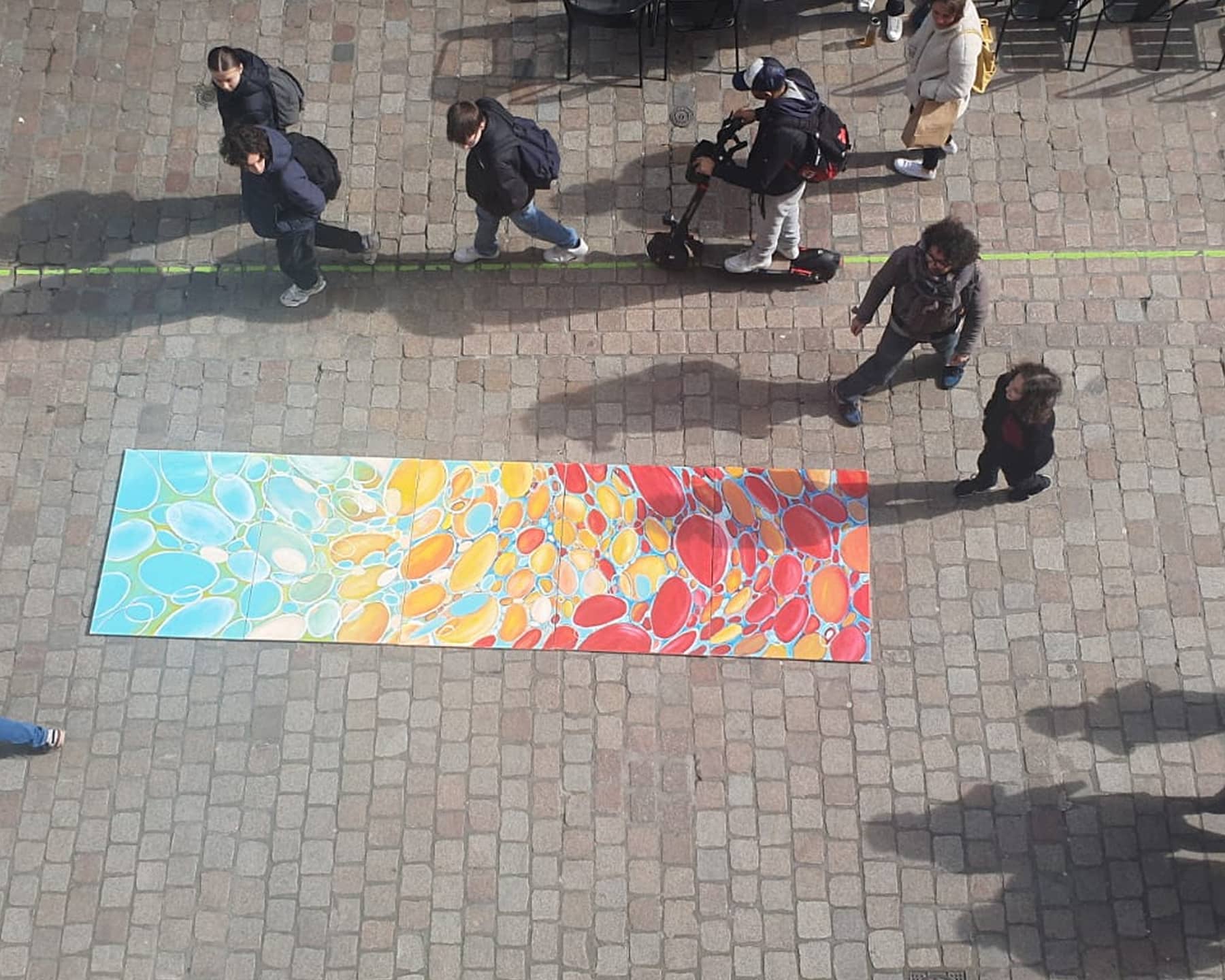 Série de cinq photos documentant une performance artistique itinérante dans l'espace public. Diego transporte une grande toile à travers différents lieux urbains. Cette toile peinte aux motifs de cercles colorés rouge, orange, jaune et bleu est déployée dans divers espaces : une place pavée vue de haut, une pelouse au bord d'un cours d'eau longeant un mur ancien, une rue piétonne animée, et devant un château médiéval. L'œuvre nomade dialogue ainsi avec l'architecture historique et contemporaine de la ville.