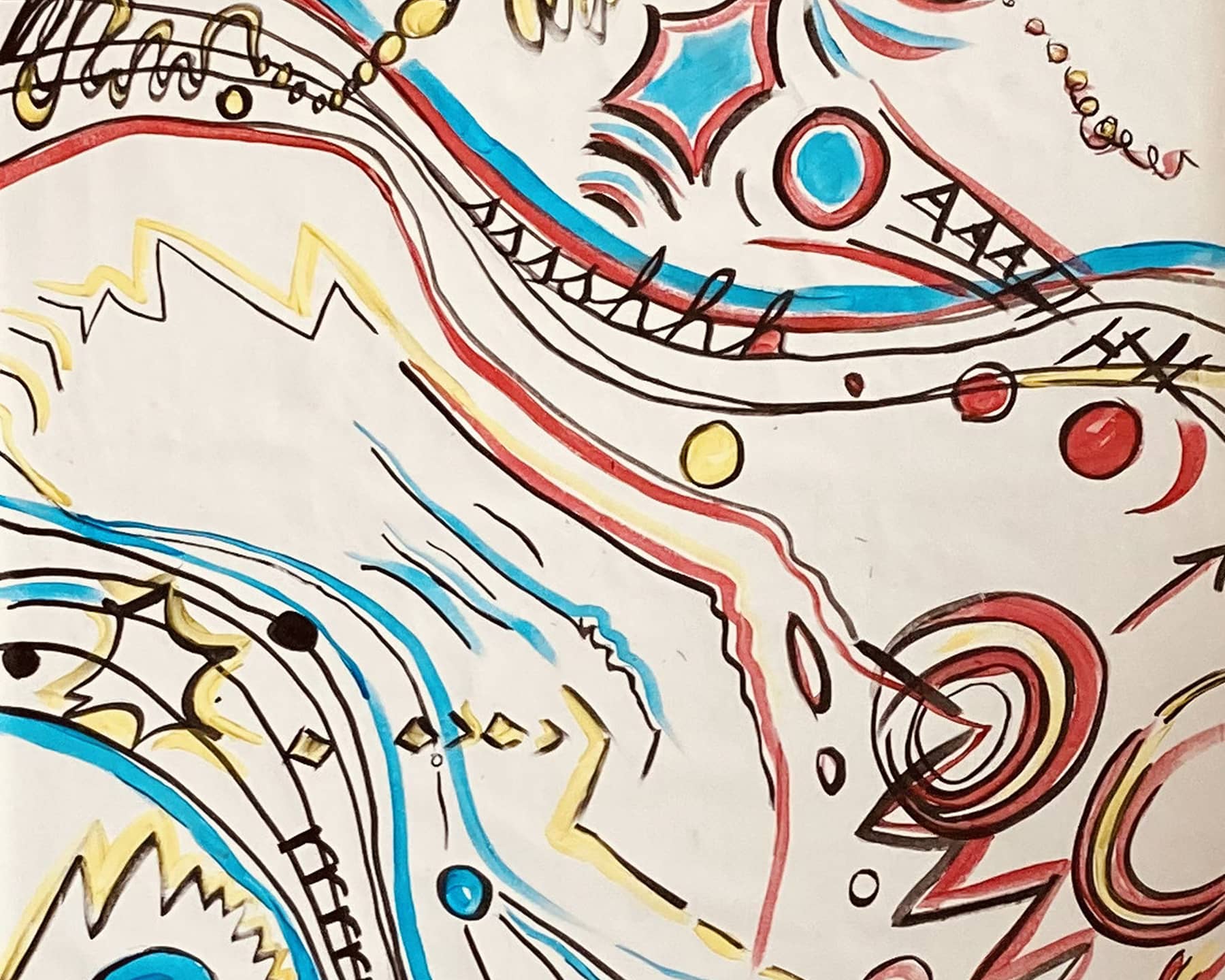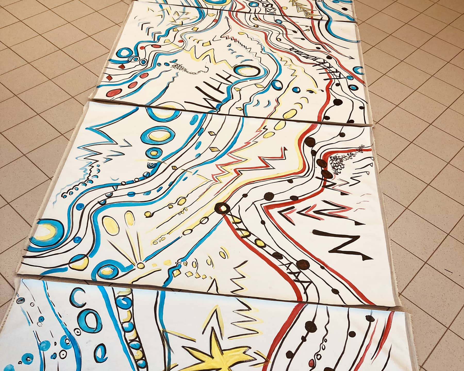 Série de quatre photos présentant une fresque collective réalisée sur une longue bande de papier blanc déployée au sol dans une salle équipée d'instruments de musique. La composition abstraite mêle lignes sinueuses bleues, rouges et noires, cercles concentriques, éclairs jaunes, motifs géométriques et formes organiques. Les gros plans révèlent la richesse des détails spontanés et la diversité des styles graphiques qui cohabitent dans cette création participative énergique.