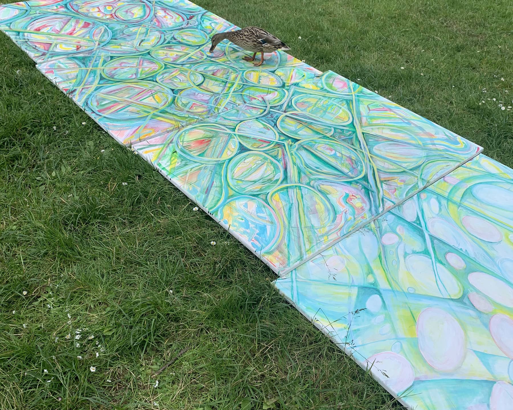 Série de cinq photos documentant le parcours d'une fresque collective nomade. Un groupe de participants présente fièrement leur création depuis un balcon à rampe en fer forgé dans un bâtiment historique. L'œuvre aux motifs organiques et tourbillonnants dans des tons pastel de vert, bleu, rose et jaune est ensuite exposée dans différents lieux : une place pavée urbaine vue de haut où les créateurs se tiennent autour de leurs toiles, et des espaces verts où la fresque repose paisiblement sur l'herbe