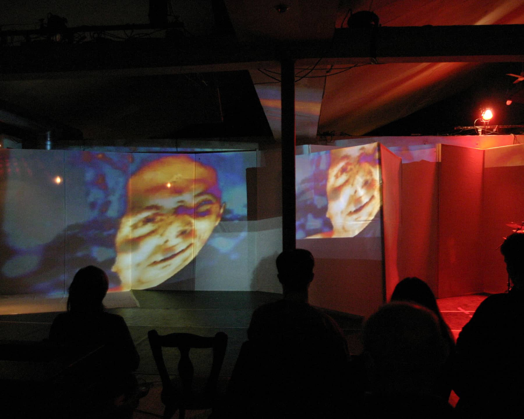Série de trois photos prises dans l’environnement d’une salle de spectacle, depuis le public. Il fait sombre, des lumières bleues et rouges créent une ambiance étrange. On voit des projections d’images sur des panneaux blancs (des visages, de formes noires et blanches…). Des musiciens accompagnent la performance : la troisième photo est un gros plan sur le batteur.