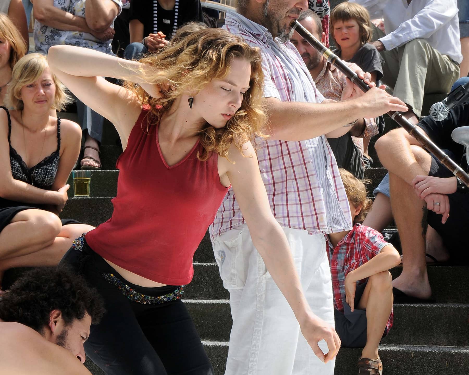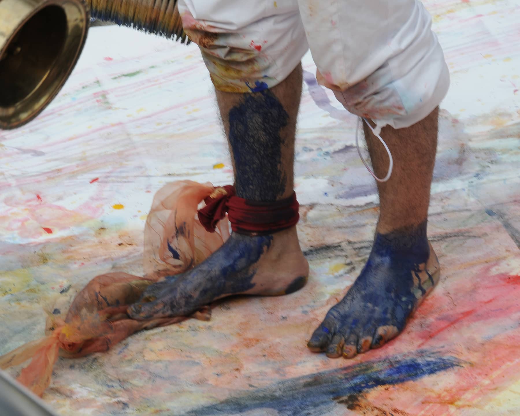 Série de quatre photos d’un spectacle de plein air, en ville. Le public est assis sur des marches d'escalier. Sur la « scène », des artistes jouent de la clarinette, peignent sur un support au sol, dansent dans la peinture. Des gros plans montrent le visage d’une comédienne sous un voile coloré, ou bien les pieds d’un danseur, couverts de peinture bleue.