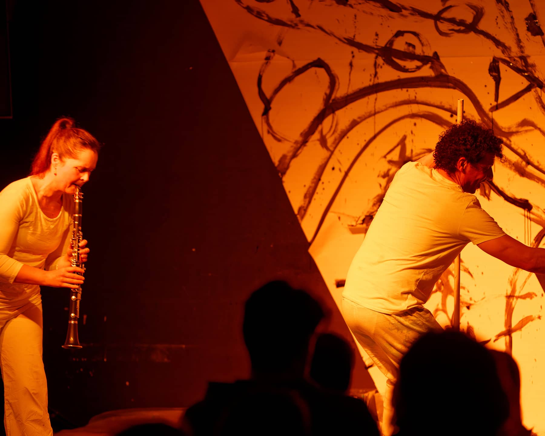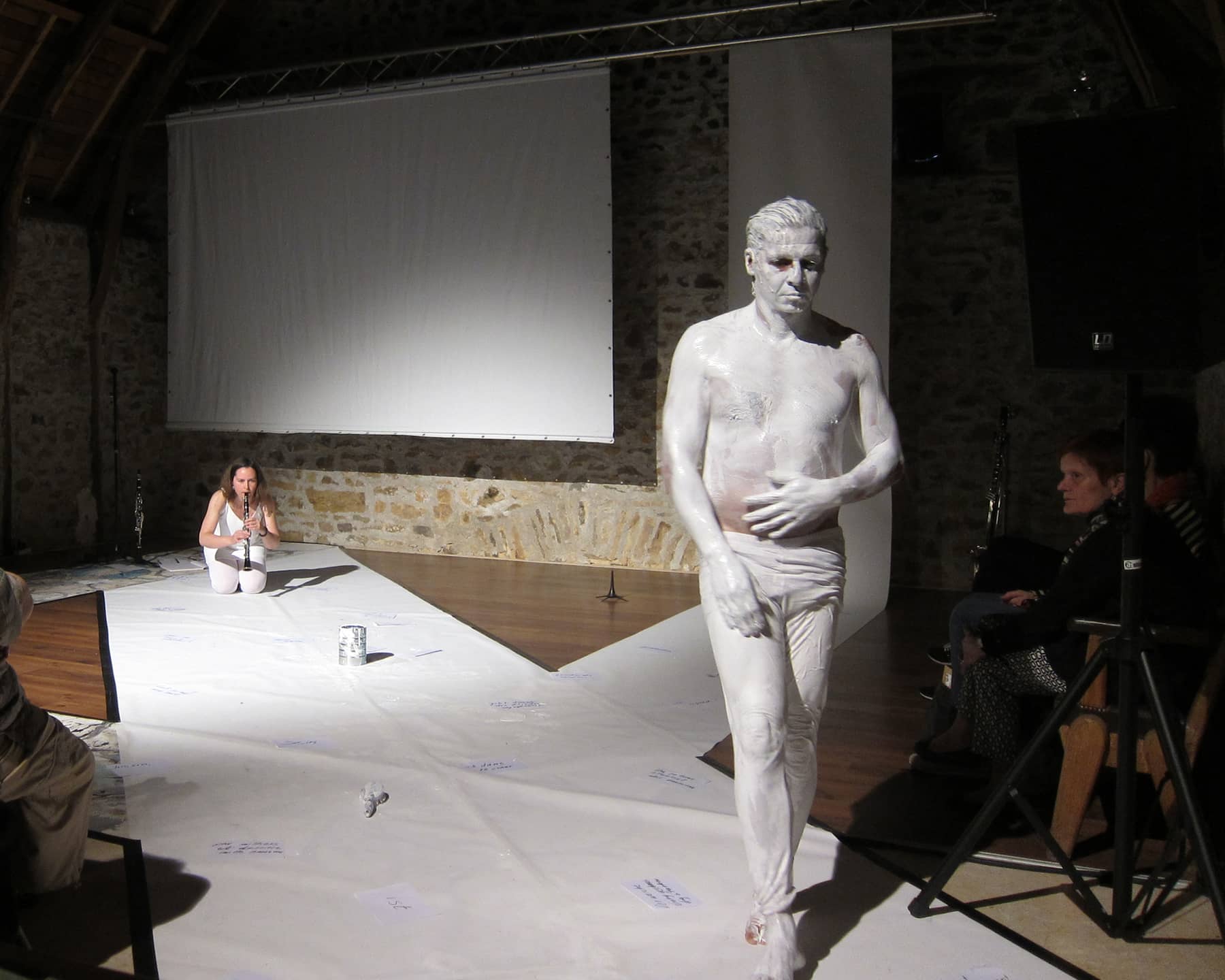 Série de quatre photos d’une performance en intérieur. De longues bandes de papier blancs sont installées sur le parquet, se croisant de manière symétrique. On voit deux artistes, une musicienne qui joue de la clarinette, habillée en blanc, et un comédien presque nu, recouvert du peinture blanche. L’homme en blanc effectue des mouvements et peint sur les bandes de papier avec un très long pinceau pendant que la musique se joue.