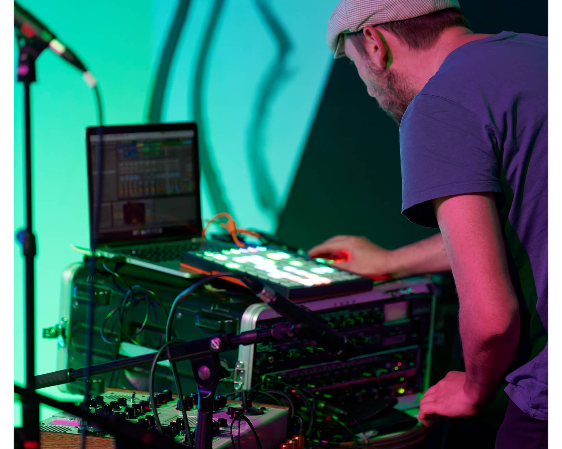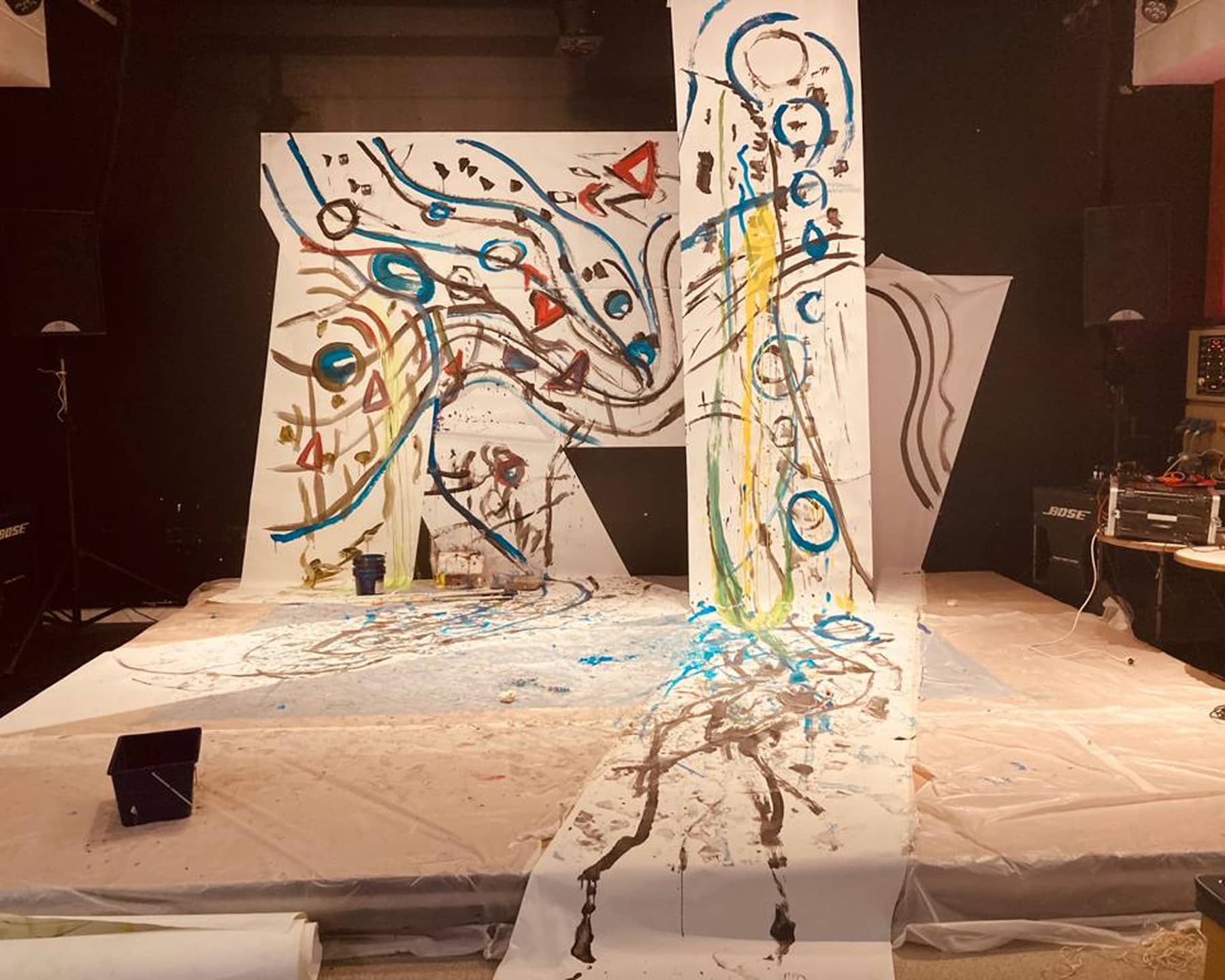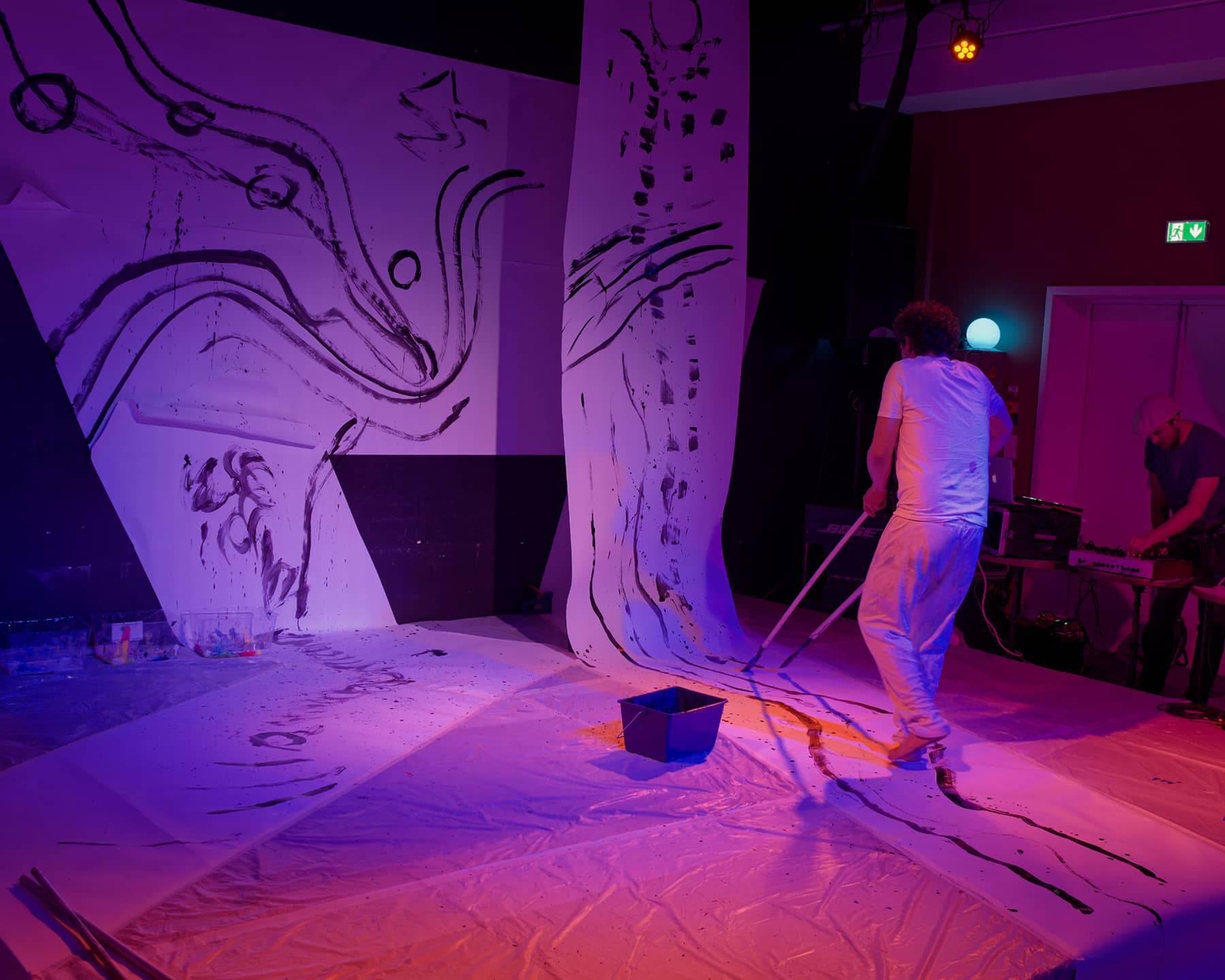 Série de quatre photos montrant différents moment d’une fresque musicale en intérieur. Des bandes de papiers sont accrochées en haut des murs et continuent sur le sol, protégé par des bâches en plastique. Un musicien se tient derrière sa platine de musique électronique. Diego Lis crée des fresques abstraites sur les bandes de papier, au son de la musique. L’éclairage de la pièce varie : blanc, violet, vert, orange… Changeant l’ambiance et la perception de la fresque en cours.