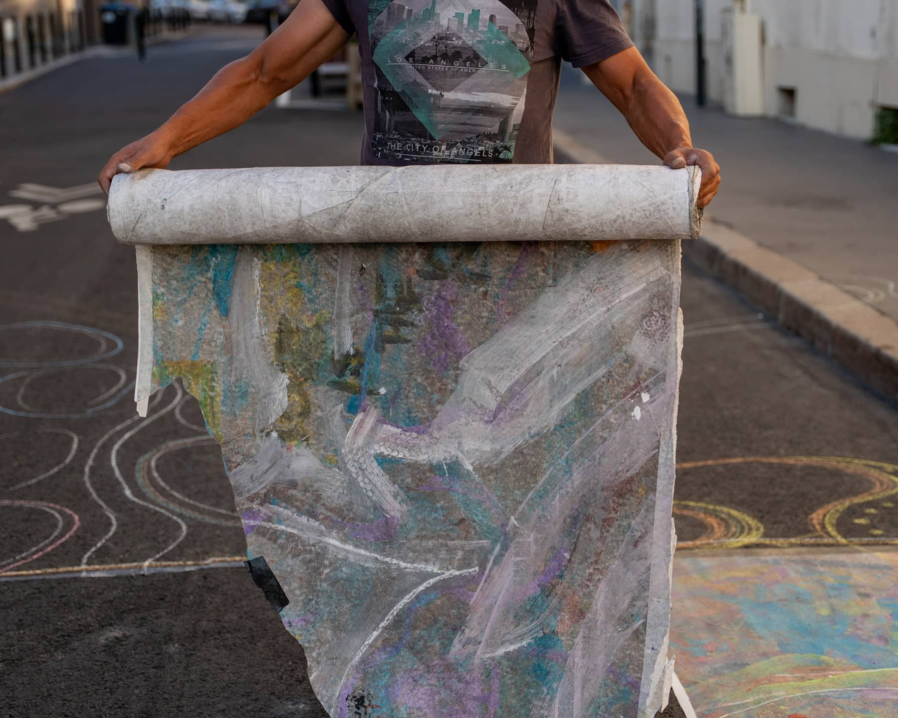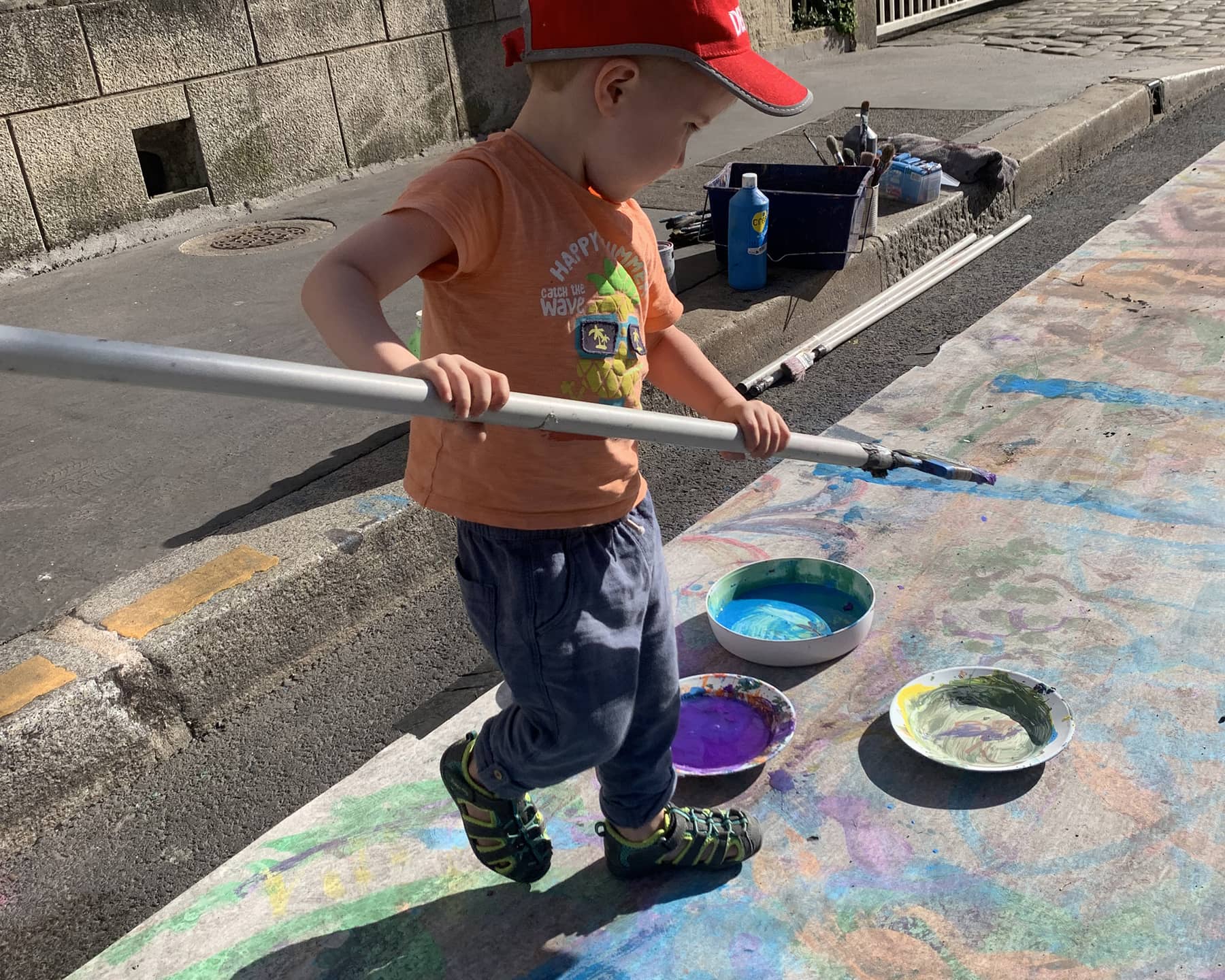 Série de cinq photos d'ateliers de peinture participatifs dans l'espace public. Des participants de tous âges créent collectivement sur de grandes toiles et fresques au sol, en utilisant de longs pinceaux pour tracer des lignes et formes colorées. Les créations se déploient dans des rues et places, transformant temporairement l'asphalte et les pavés en surfaces artistiques aux motifs abstraits et organiques. L'atmosphère conviviale montre le processus créatif en action, du déroulement des toiles vierges jusqu'aux œuvres finales