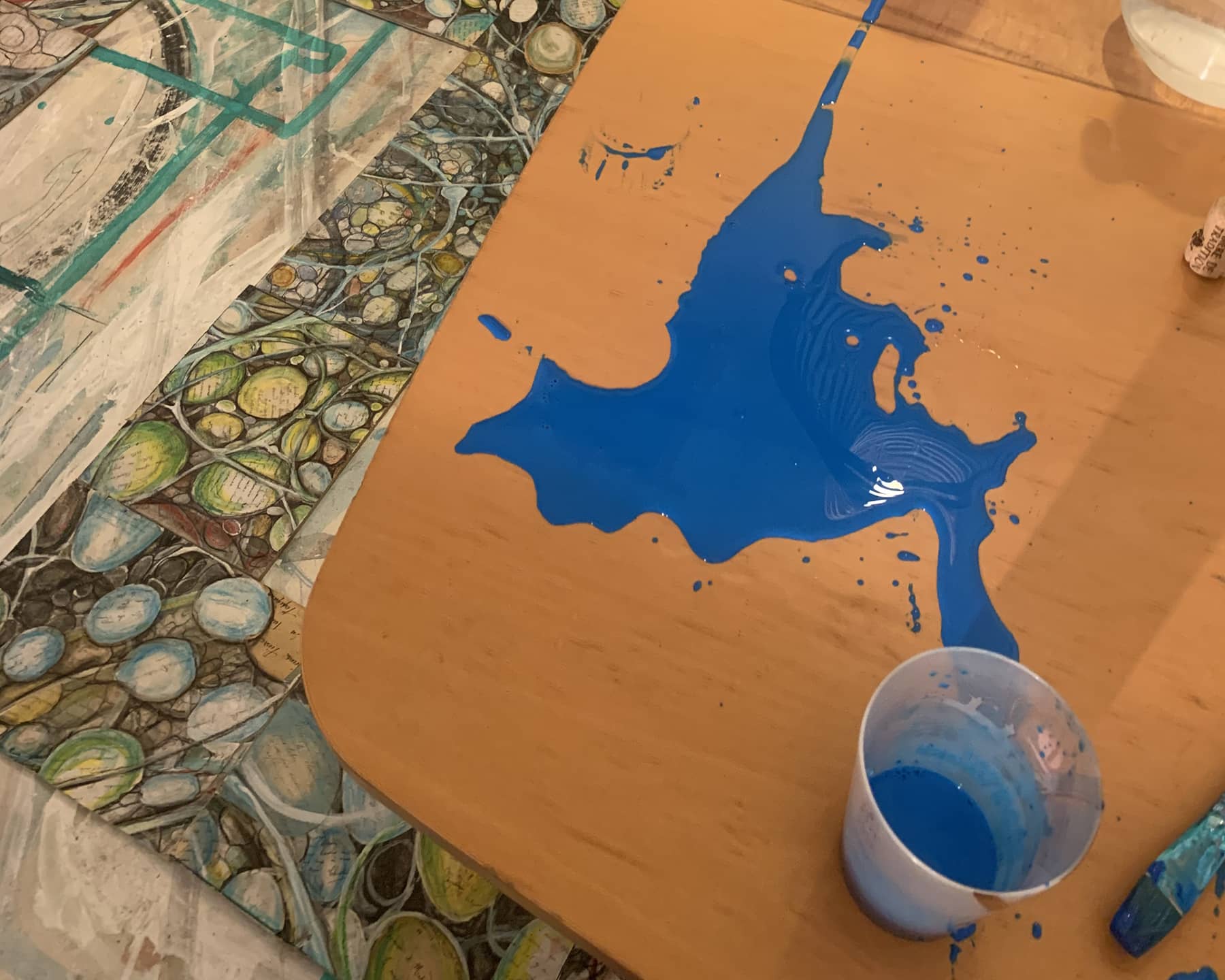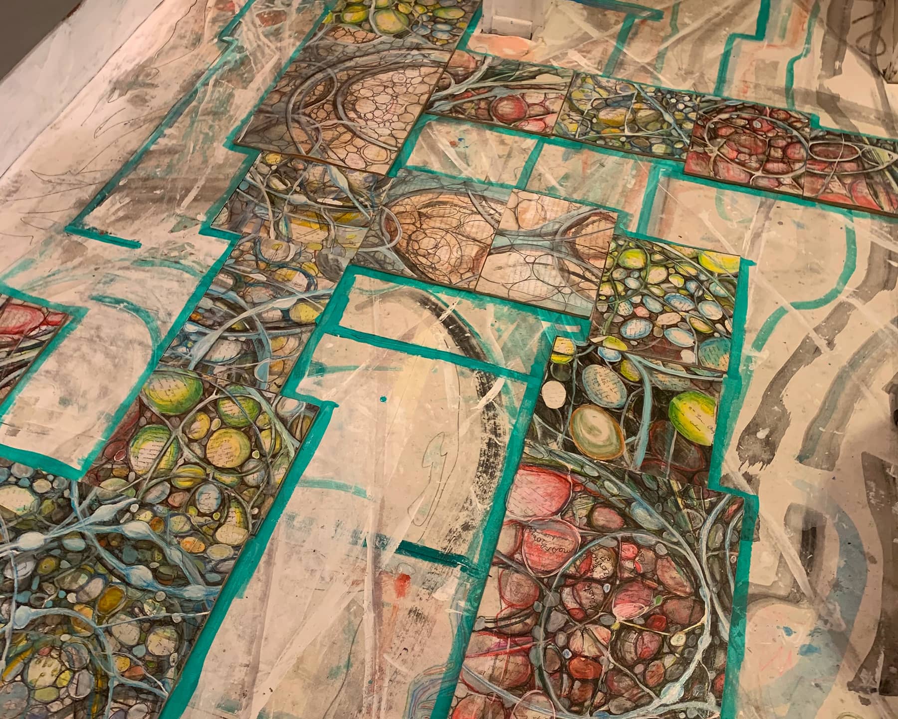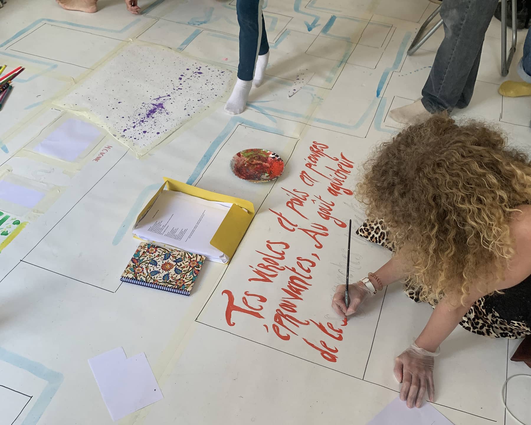 Série de cinq photos documentant différentes étapes de création artistique. On y voit des œuvres au sol avec des motifs organiques colorés et des lignes géométriques vertes, une participante écrivant un texte en rouge sur papier, une tache de peinture bleue liquide sur fond orange, et un artiste travaillant accroupi sur une installation en forme de croix composée de panneaux peints disposés dans un atelier.