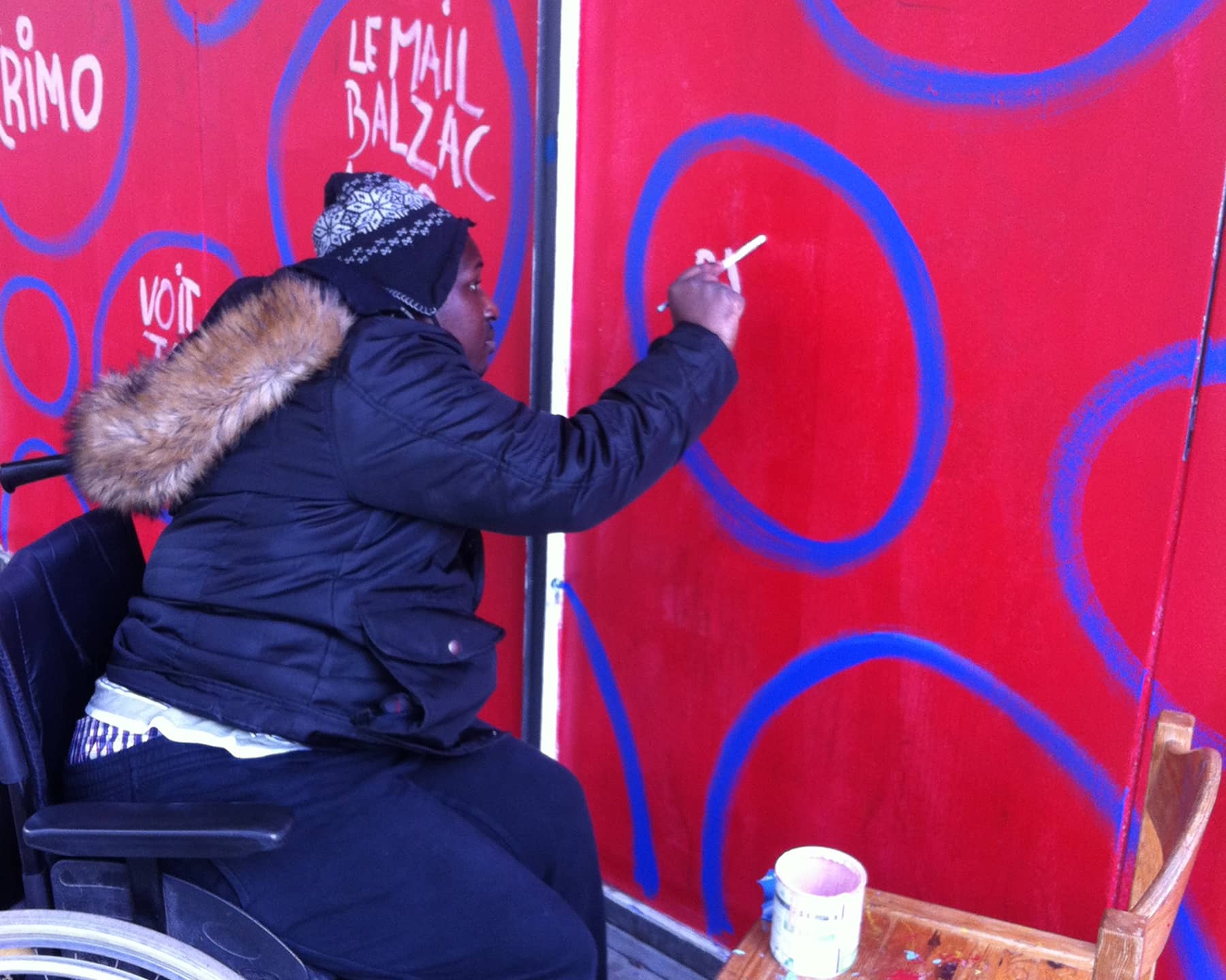 Série de cinq photos présentant la création collaborative d'une fresque murale sur de grandes vitrines. Les participants, dont une personne en fauteuil roulant, peignent sur des panneaux rouges et bleus ornés de cercles colorés et de noms inscrits à l'intérieur. Une photo montre Diego Lis posant avec un rouleau de peinture. Les fresques achevées transforment les façades de bâtiments avec leurs motifs vibrants aux teintes rouge, bleu, orange et jaune, créant une galerie artistique accessible à tous dans l'espace urbain.