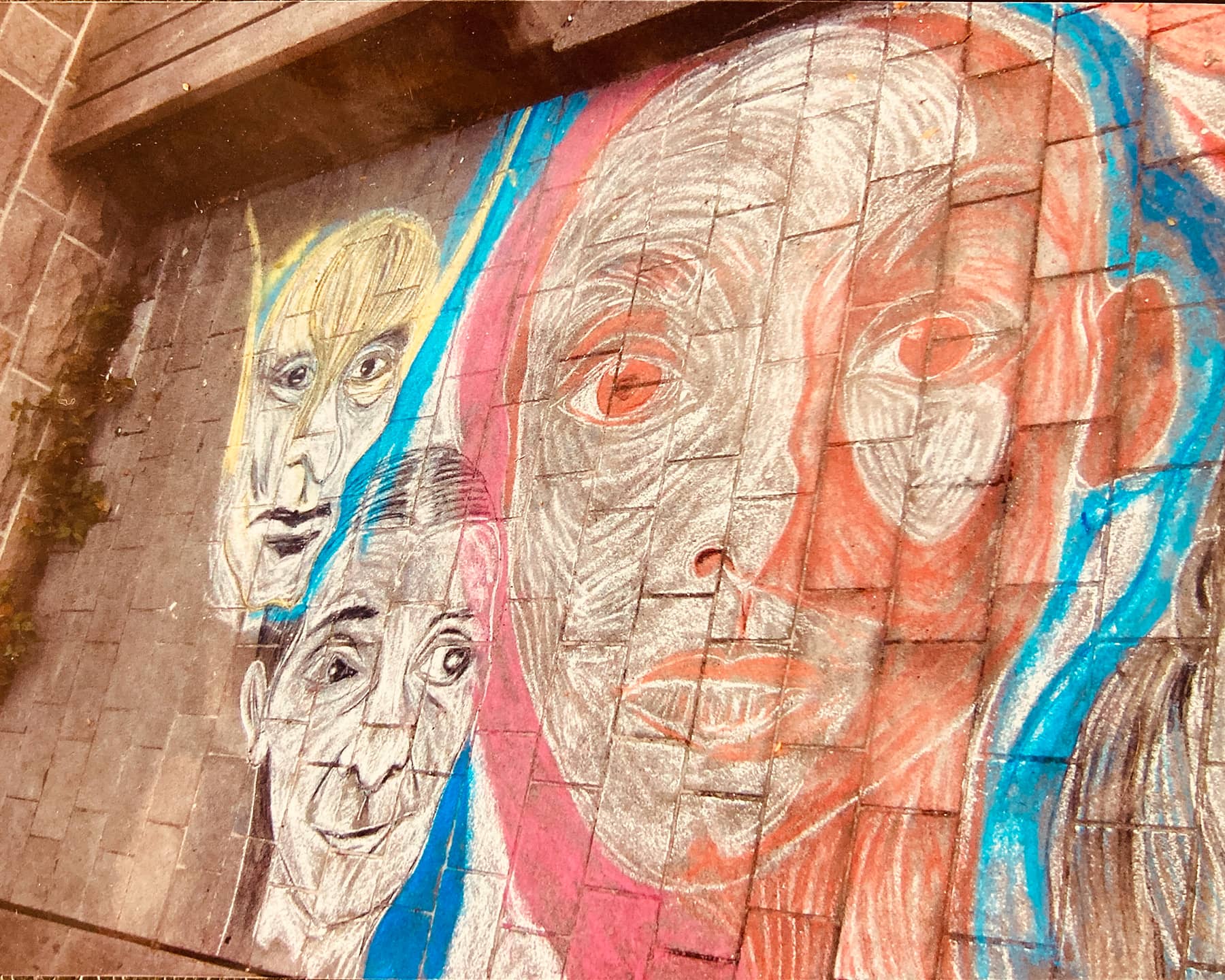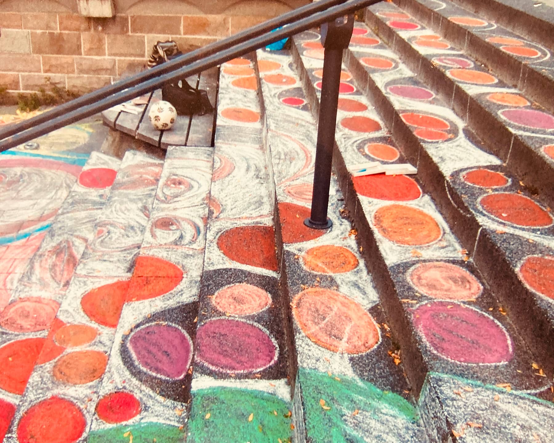 Série de cinq photos présentant des gros plans d'une fresque murale peinte sur un escalier extérieur. Les marches sont ornées de portraits expressifs aux traits dessinés à la craie ou au fusain, encadrés de bandes colorées rouge, rose, bleu et jaune. Certaines marches comportent des motifs de cercles concentriques orangés et roses. La composition joue avec l'architecture de l'escalier, transformant chaque marche en fragment d'une œuvre collective qui se déploie verticalement le long de la rampe métallique.