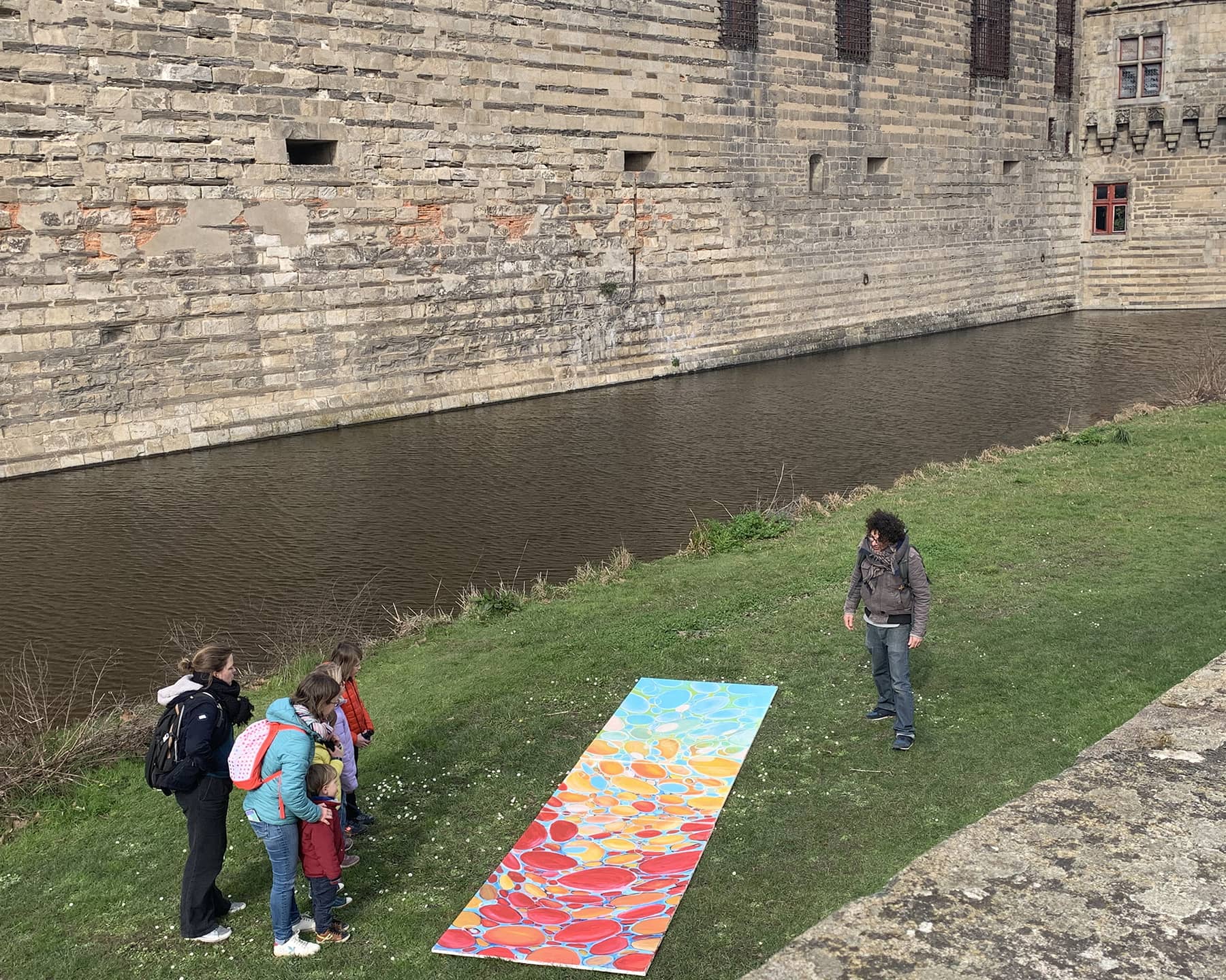 Série de cinq photos documentant une performance artistique itinérante dans l'espace public. Diego transporte une grande toile à travers différents lieux urbains. Cette toile peinte aux motifs de cercles colorés rouge, orange, jaune et bleu est déployée dans divers espaces : une place pavée vue de haut, une pelouse au bord d'un cours d'eau longeant un mur ancien, une rue piétonne animée, et devant un château médiéval. L'œuvre nomade dialogue ainsi avec l'architecture historique et contemporaine de la ville.