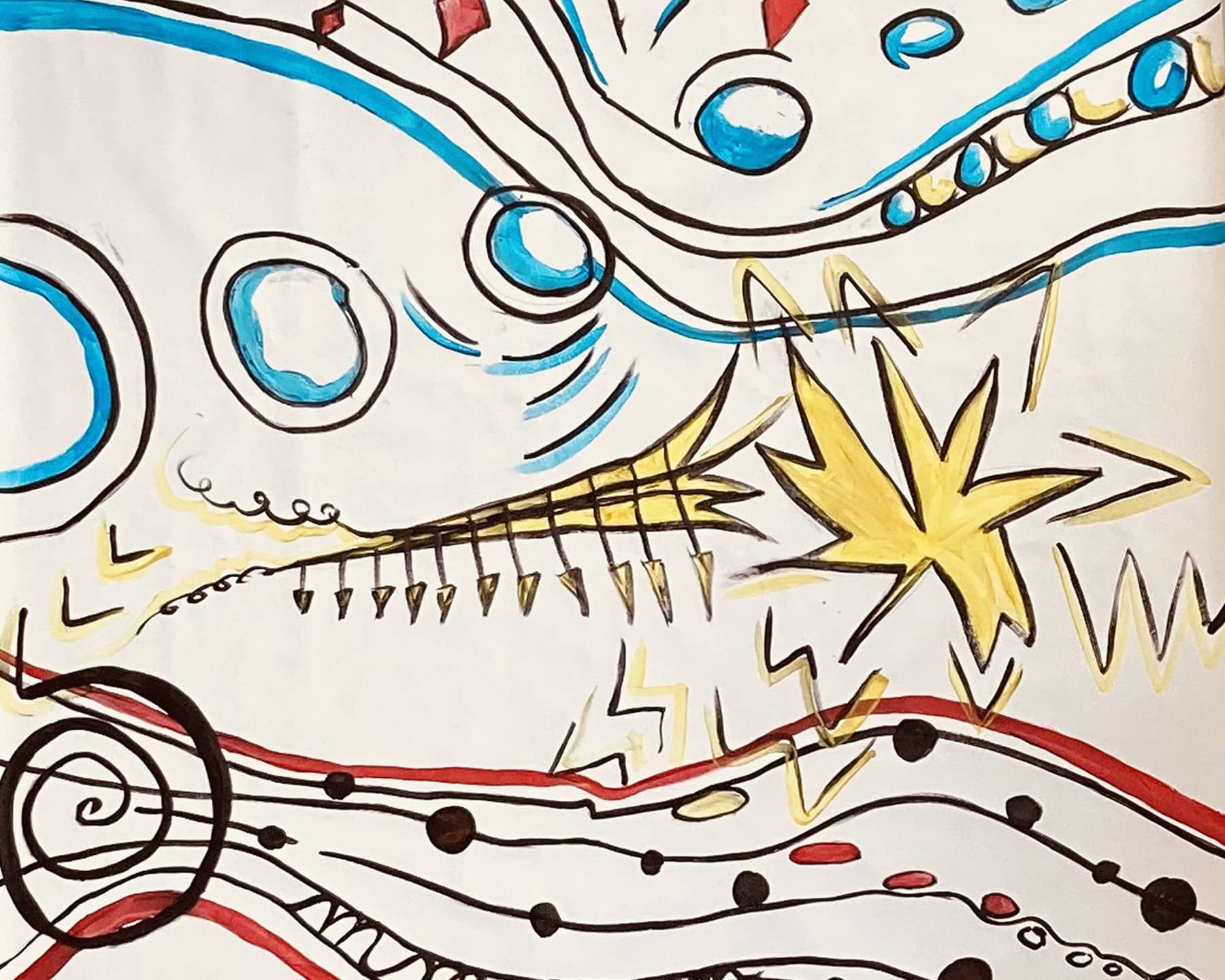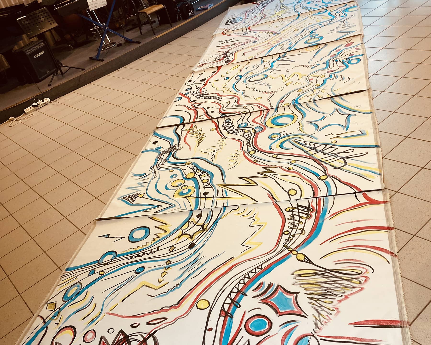 Série de quatre photos présentant une fresque collective réalisée sur une longue bande de papier blanc déployée au sol dans une salle équipée d'instruments de musique. La composition abstraite mêle lignes sinueuses bleues, rouges et noires, cercles concentriques, éclairs jaunes, motifs géométriques et formes organiques. Les gros plans révèlent la richesse des détails spontanés et la diversité des styles graphiques qui cohabitent dans cette création participative énergique.