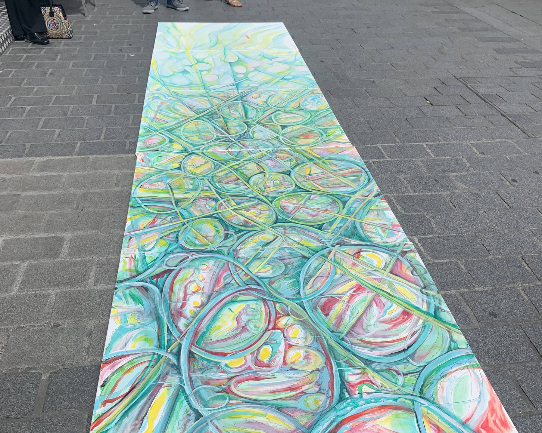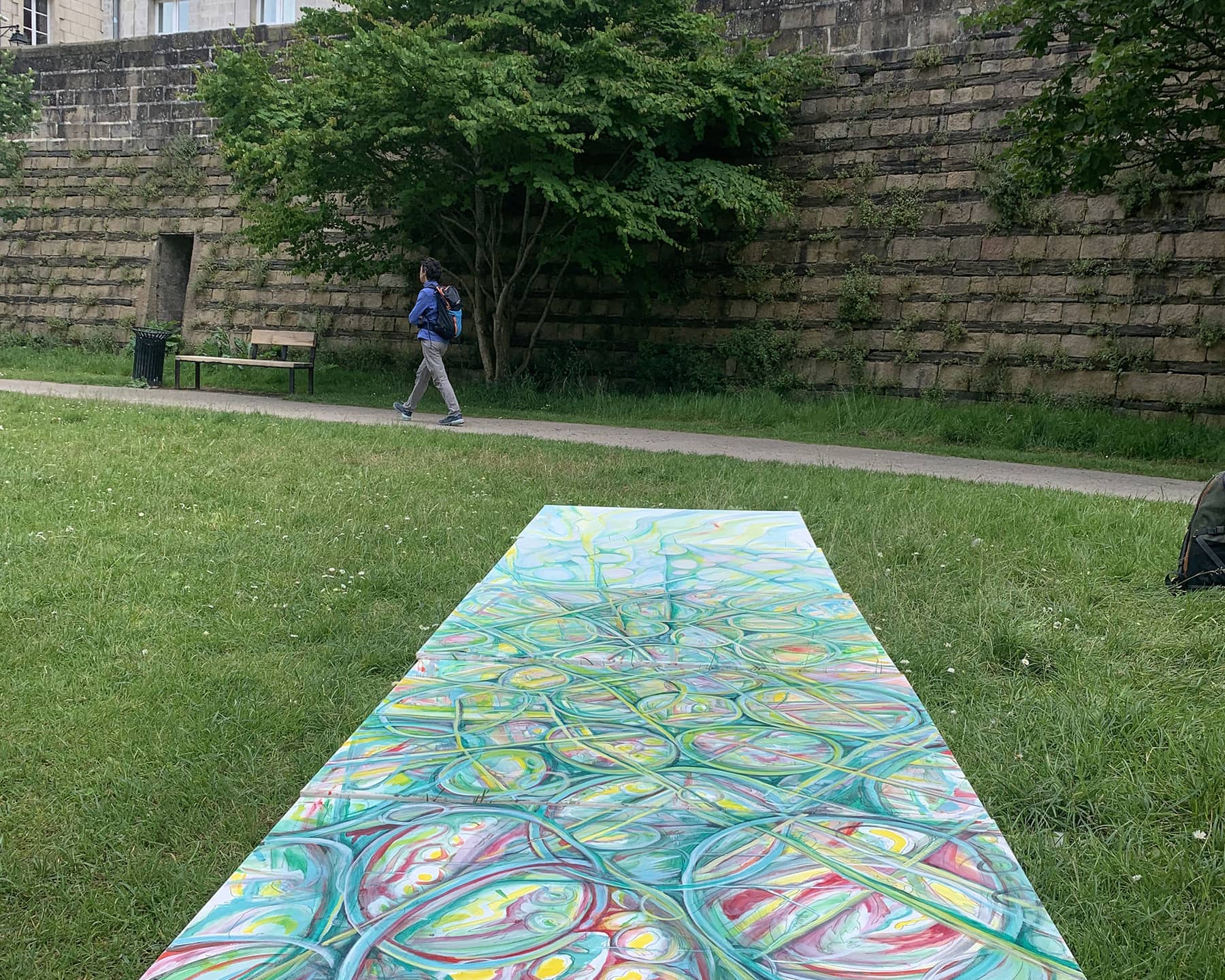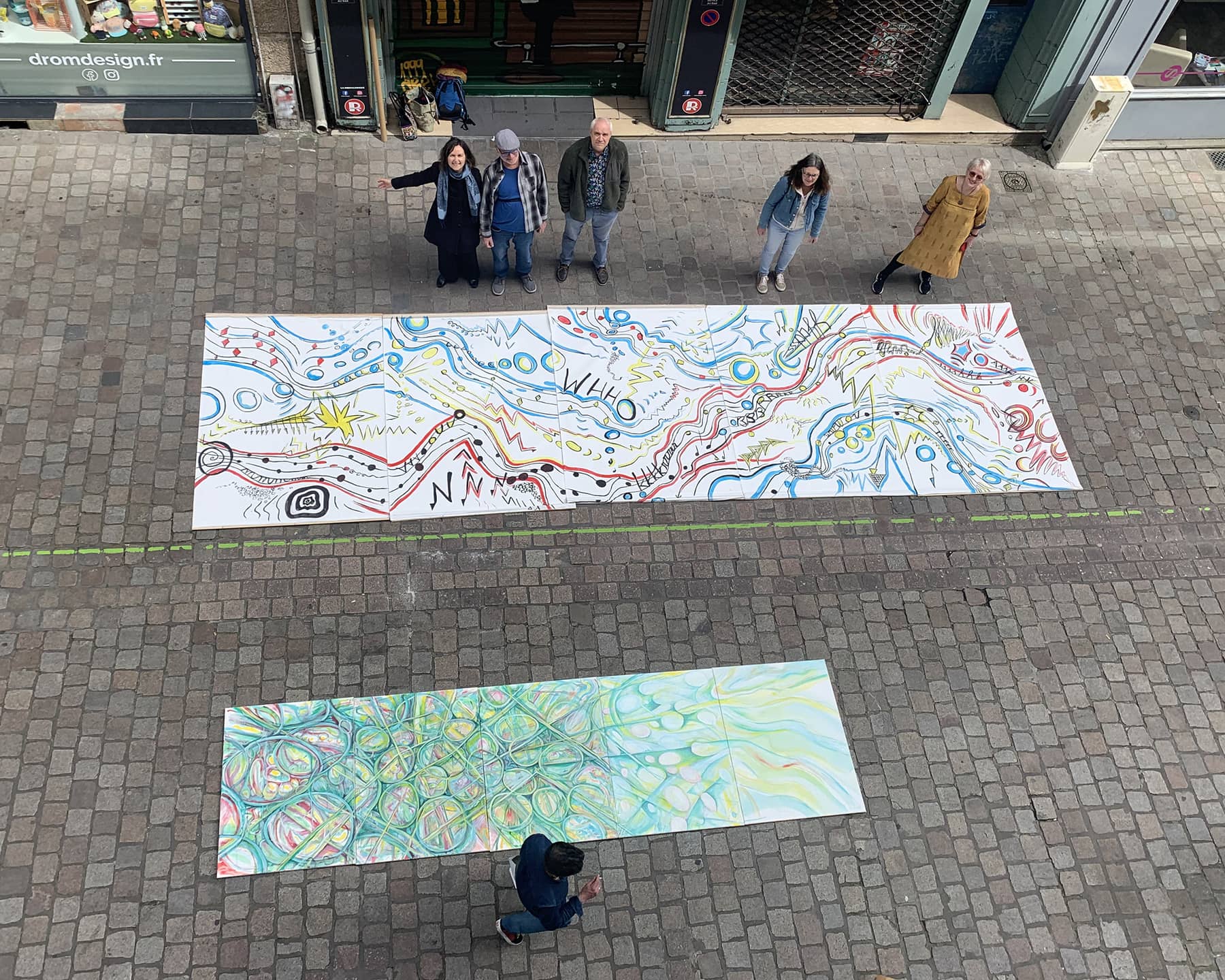Série de cinq photos documentant le parcours d'une fresque collective nomade. Un groupe de participants présente fièrement leur création depuis un balcon à rampe en fer forgé dans un bâtiment historique. L'œuvre aux motifs organiques et tourbillonnants dans des tons pastel de vert, bleu, rose et jaune est ensuite exposée dans différents lieux : une place pavée urbaine vue de haut où les créateurs se tiennent autour de leurs toiles, et des espaces verts où la fresque repose paisiblement sur l'herbe