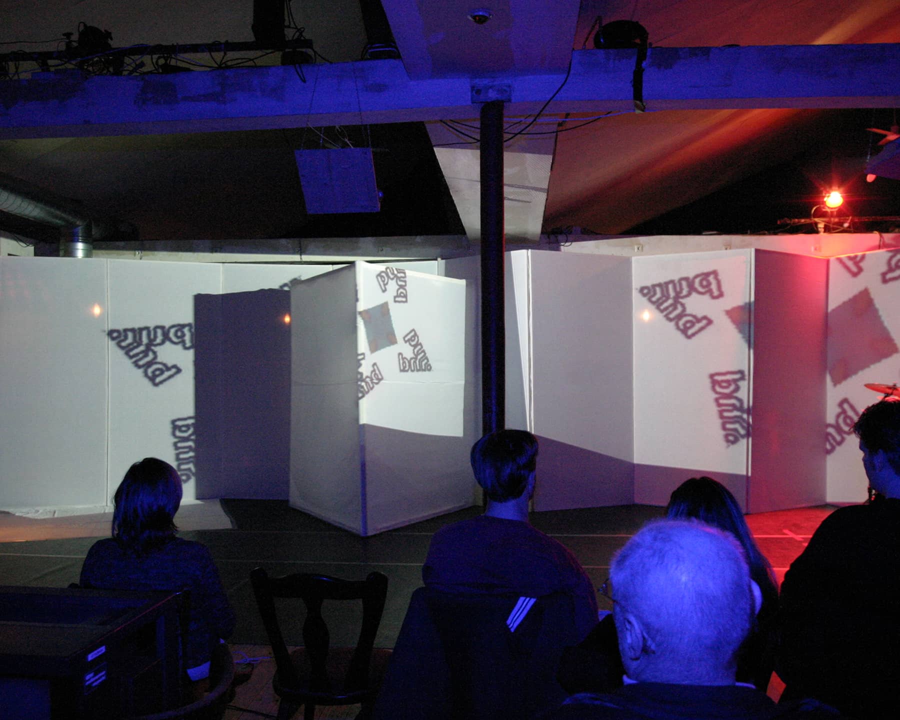 Série de trois photos prises dans l’environnement d’une salle de spectacle, depuis le public. Il fait sombre, des lumières bleues et rouges créent une ambiance étrange. On voit des projections d’images sur des panneaux blancs (des visages, de formes noires et blanches…). Des musiciens accompagnent la performance : la troisième photo est un gros plan sur le batteur.