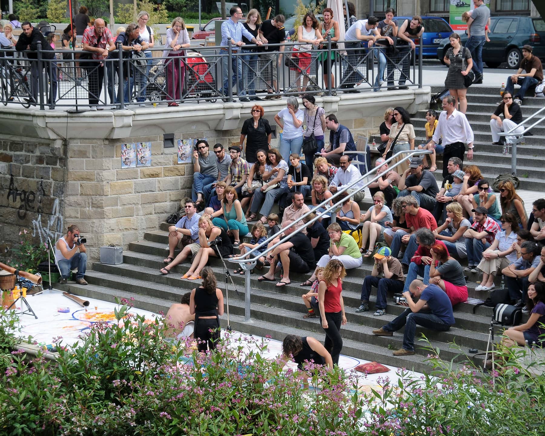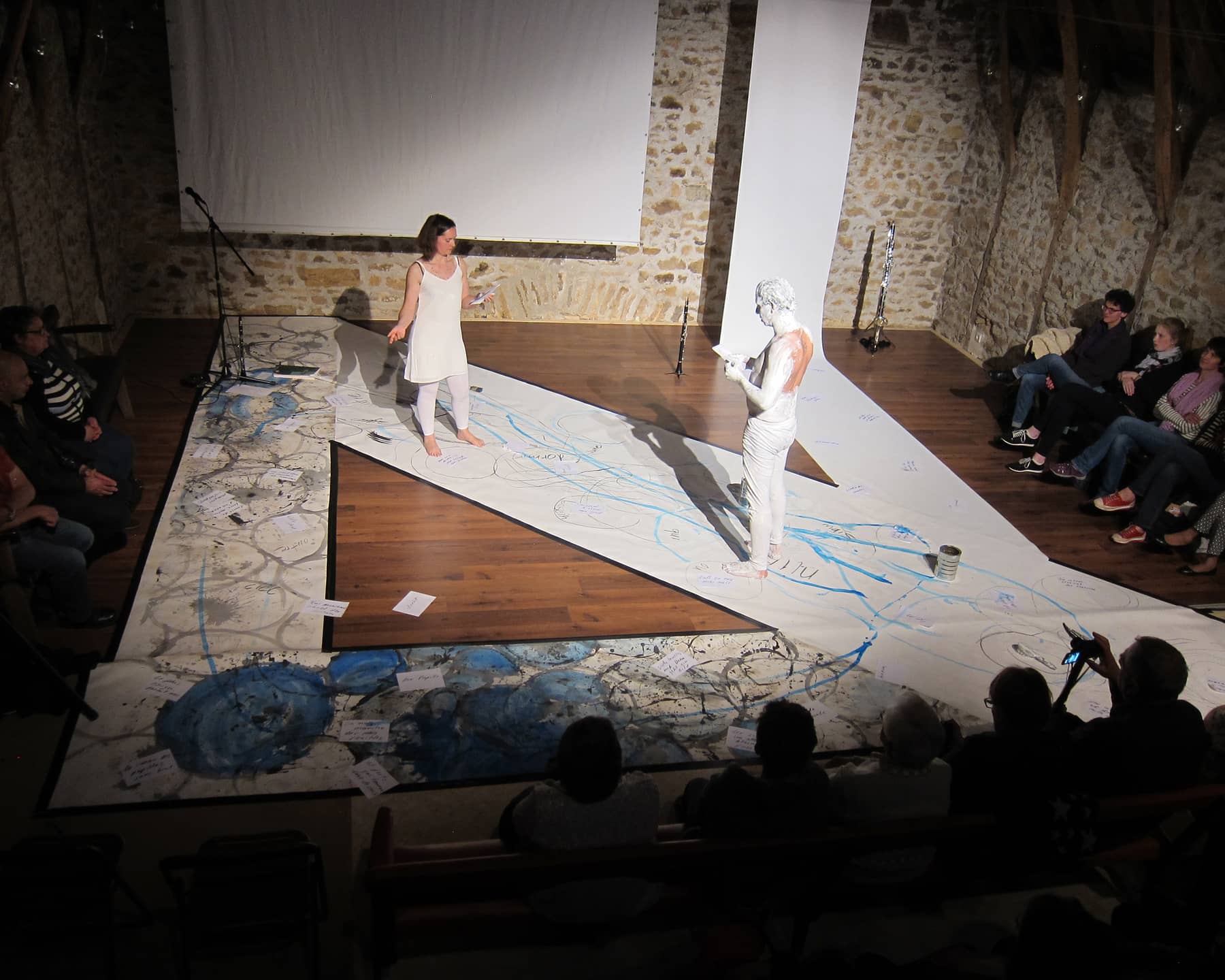 Série de quatre photos d’un spectacle de plein air, en ville. Le public est assis sur des marches d'escalier. Sur la « scène », des artistes jouent de la clarinette, peignent sur un support au sol, dansent dans la peinture. Des gros plans montrent le visage d’une comédienne sous un voile coloré, ou bien les pieds d’un danseur, couverts de peinture bleue.