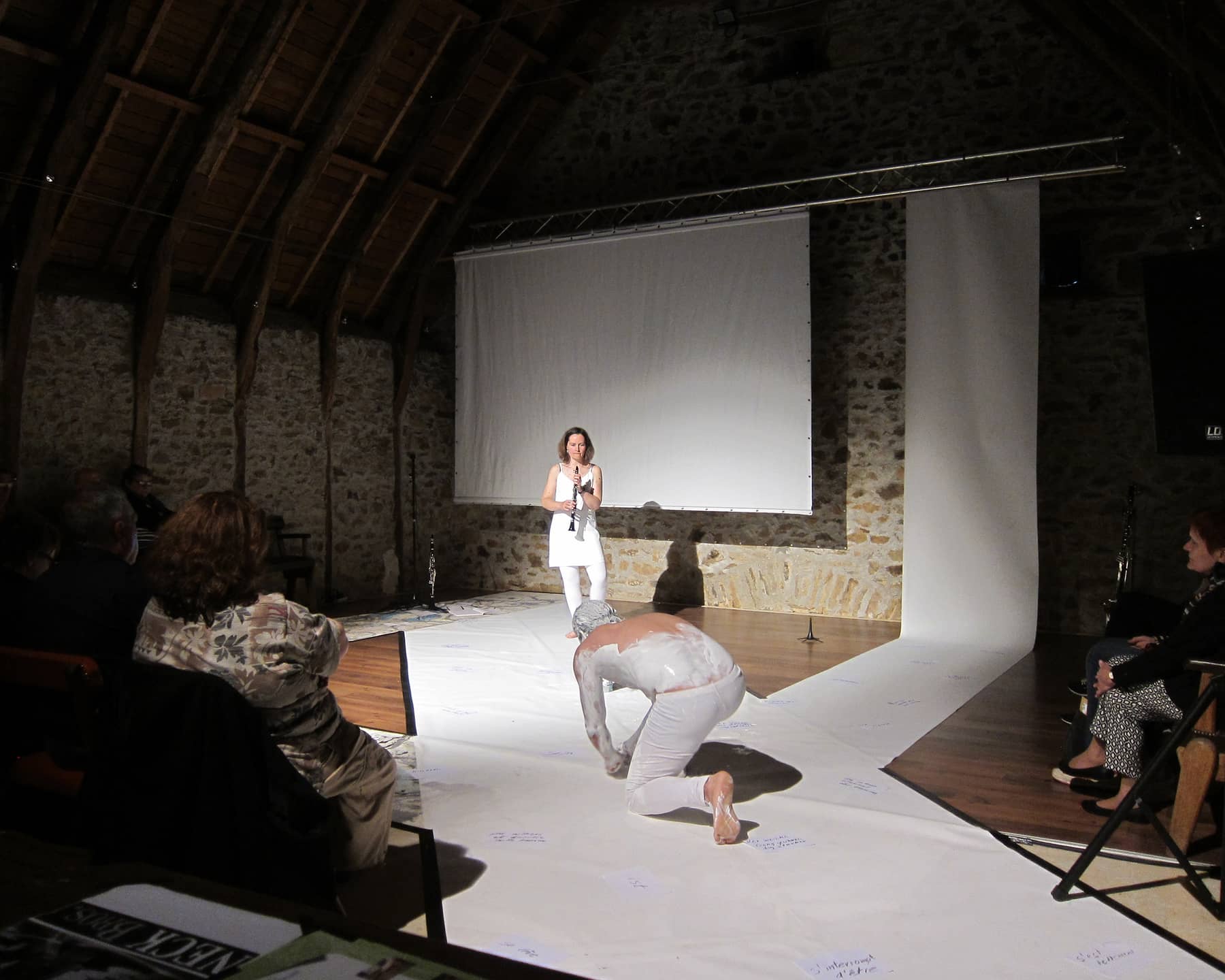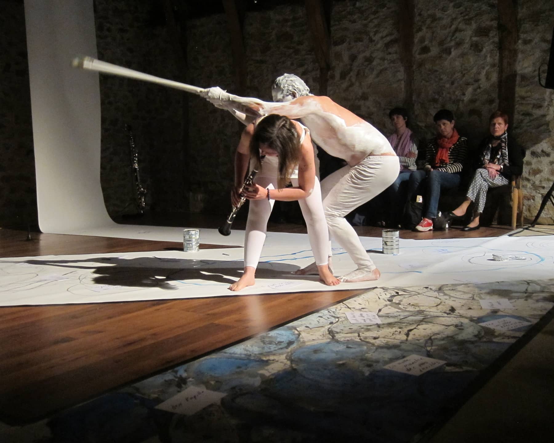 Série de quatre photos d’une performance en intérieur. De longues bandes de papier blancs sont installées sur le parquet, se croisant de manière symétrique. On voit deux artistes, une musicienne qui joue de la clarinette, habillée en blanc, et un comédien presque nu, recouvert du peinture blanche. L’homme en blanc effectue des mouvements et peint sur les bandes de papier avec un très long pinceau pendant que la musique se joue.