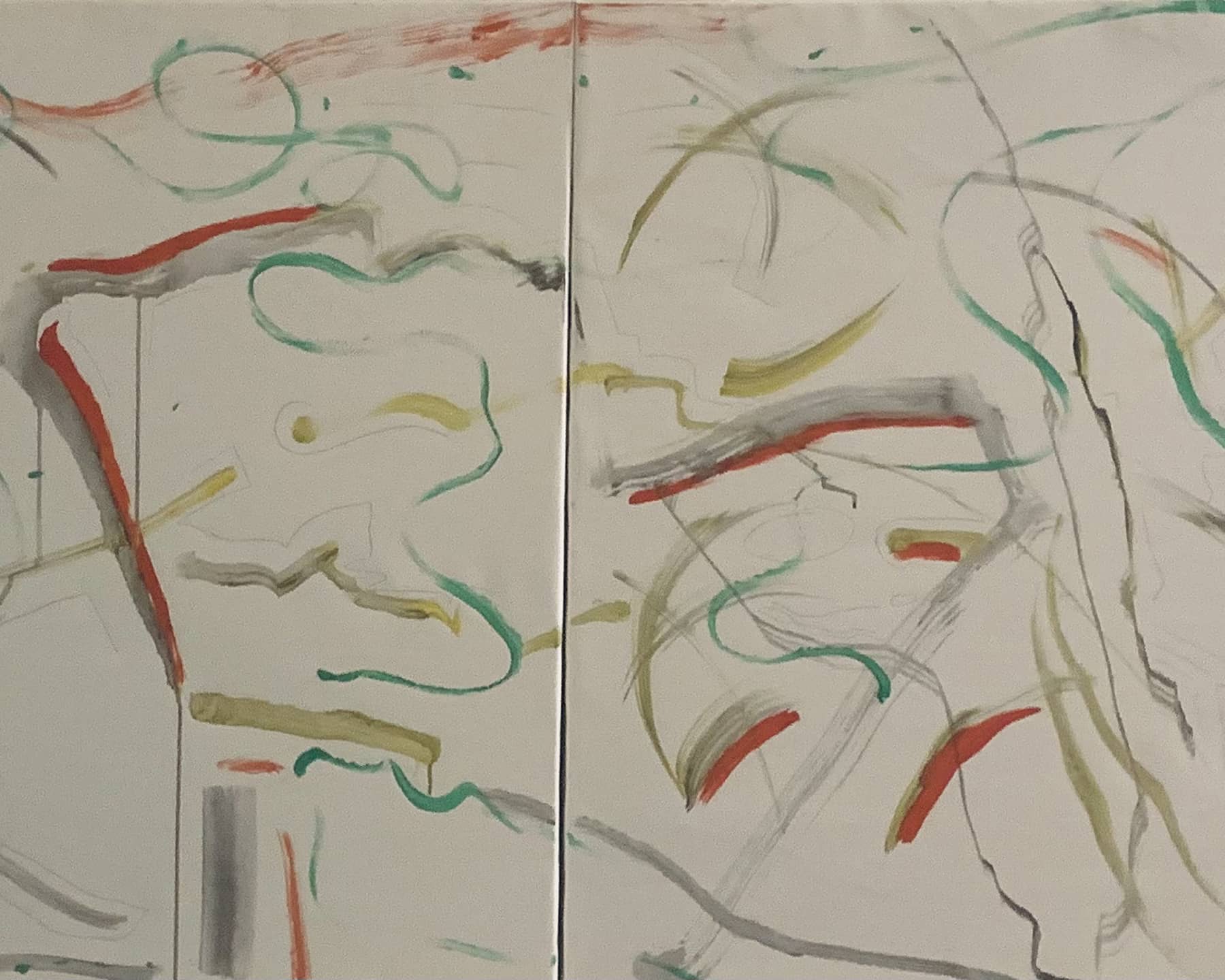 Série de trois photos représentant différents moments de l’atelier, qui se tient dans un salon aux murs blancs. On voit plusieurs personnes dessiner et peindre sur un même support de papier, ou bien Diego Lis effectuer une fresque à l’aide d’un très long pinceau, tout en créant une chorégraphie avec tout son corps. Une autre image montre le résultat : des traits et taches colorés, éparpillés sur le support blanc.